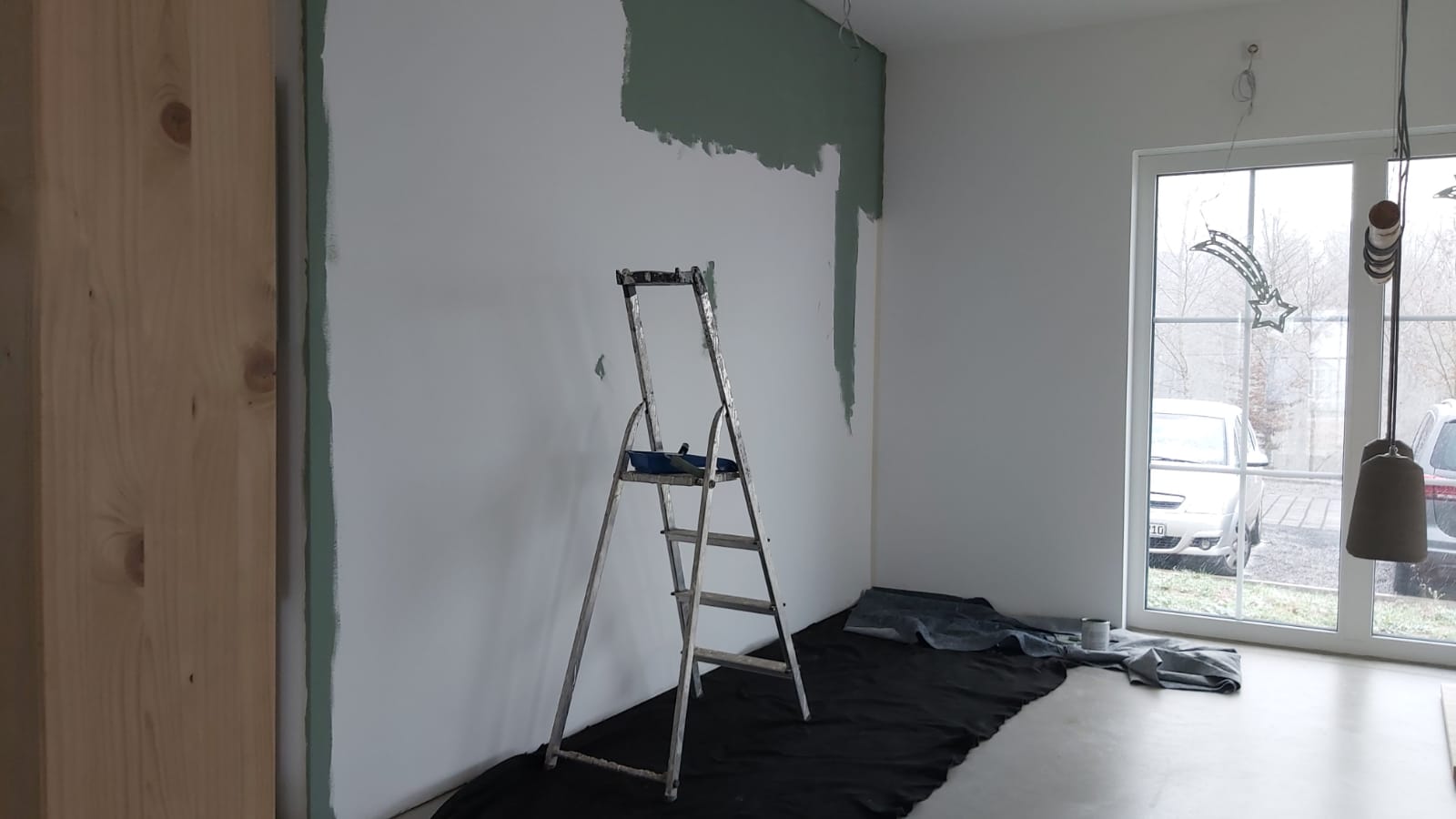 Wir starten den Innenausbau mit der Gestaltung der Spielflächen. Die Wand der Bausteinecke wird gerade gestrichen. Auch der Wickelbereich ist schon in der Entstehung.