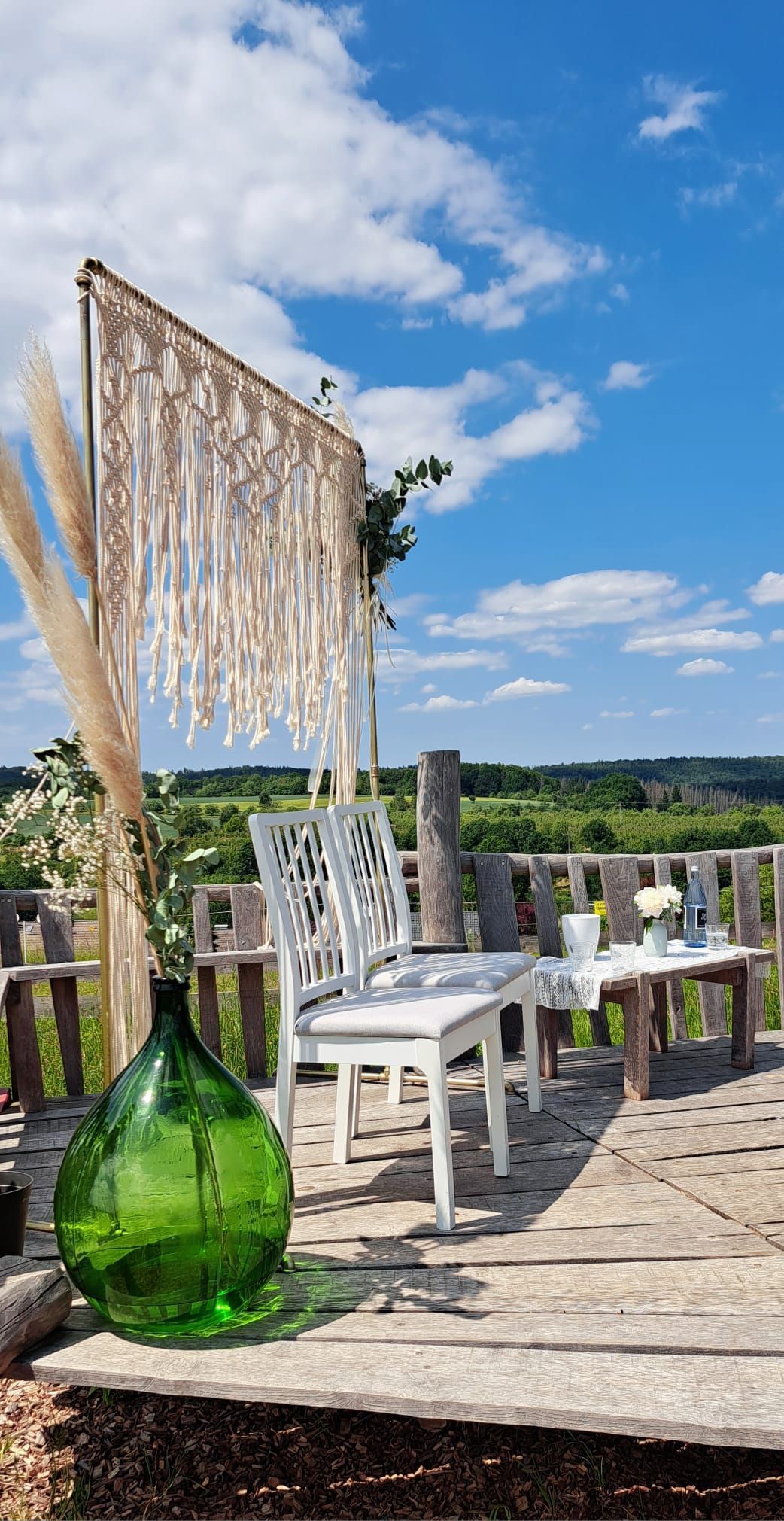 Im Jahr 2023 haben wir 6 Hochzeiten bei uns ausgerichtet. Diese hier, mit Trauung vor Ort auf unserer Aussichtsterrasse, wurde von einer Hochzeitsplanerin begleitet. Alle Hochzeiten hatten Sonnenschein gebucht - was wir natürlich nicht versprechen können ;-) Generell gibt es innen 50 Plätze und außen 30 Plätze überdacht. Unsere gesamte Kapazität liegt bei ca. 150 Plätzen.